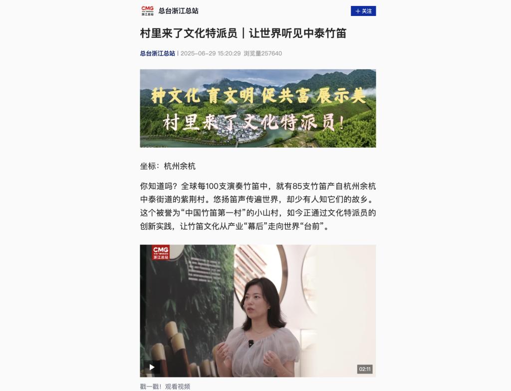 你知道吗?全球每100支演奏竹笛中,就有85支竹笛产自杭州余杭中泰街道的紫荆村。悠扬笛声传遍世界,却少有人知它们的故乡。这个被誉为“中国竹笛第一村”的小山村,如今正通过文化特派员的创新实践,让竹笛文化从产业“幕后”走向世界“台前”。
