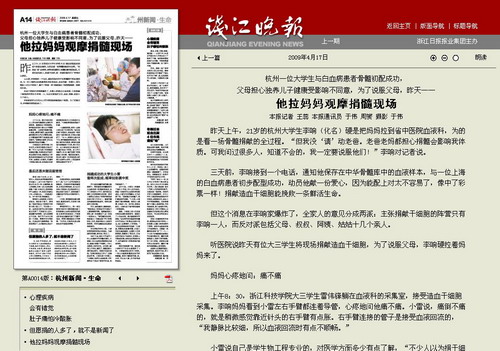 4月17日出版的钱江晚报在A14版以几近整版的篇幅对我校生化学院学生雷伟峰捐献造血干细胞拯救白血病患者的义举进行了报道。