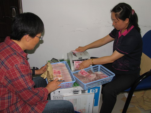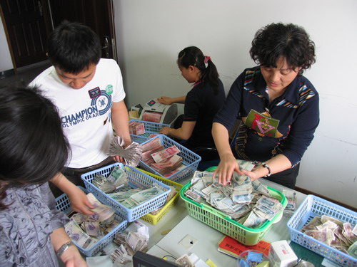 16日下午学校举行隆重简朴的捐款仪式。仪式结束后,学校立即对收到的救灾捐款进行清点。捐款中有了不少零钞、硬币,清点工作量较大。工会、监审处等部门人员主动参与。计财处腾出办公室,不少同志安排好手头的工作,主动参加清点,并迅速联系农行工作人员,争取第一时间将捐款汇出。