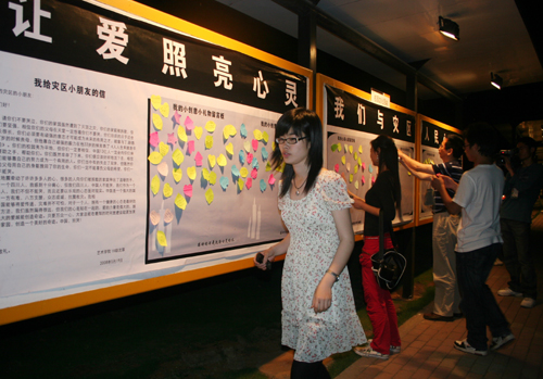 在“汶川挺住,祖国万岁”的烛光中,在场的所有师生在留言墙上写下了心中最美的祝福。经管学院的方芳同学写到:灾难是沉痛的,但中华儿女用爱铸就坚固的万里长城,撑起中国的脊梁;哀痛过后,我们将用年轻的力量建设更美好的家园。