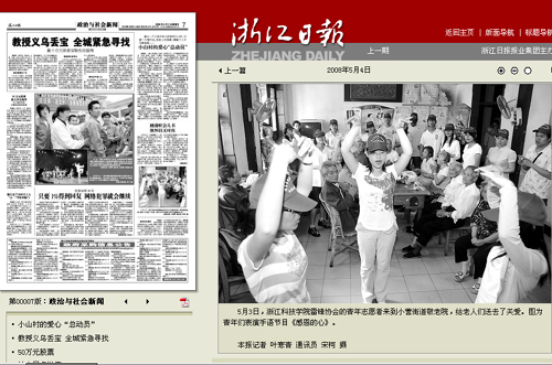 “五四”青年节前后,我校青年学生以各种方式庆祝自己的节日。5月3日,信息学院雷锋协会的志愿者们来到了杭州市小营街道陈英敬老院,给老人们送去了关爱。5月4日出版的浙江日报对这一活动进行了报道(http://zjrb.zjol.com.cn/html/2008-05/04/content_2219066.htm),5月5日出版的现代金报也报道了这一活动(http://paper.lifeningbo.com.cn/html/2008-05/05/content_61391176.htm)。
