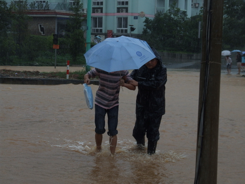 “别怕,我们来背你!”8日早上的留和路上水流湍急,窨井盖也为了泄洪而拆除。为了确保过学生过往马路安全,保卫处增派了校卫队员在学校两个大门口护送学生穿越马路。许多柔弱的女生面对眼前没过膝盖的积水,都感到害怕。校卫队员们背着他们穿过马路。洪水中的杂物将队员们的腿上、脚上刮出了道道伤痕,有些石子甚至嵌进了肉里。队员们顾不上伤痛,或背或扶一趟趟护送学生。