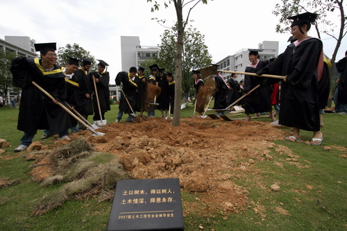 刚种下的树边,是镌刻着毕业生深情寄语的石碑,“万叶同根,千枝同源”、“饮水思源,师恩难忘;乘风破浪,铸就辉煌”、“桃李累累共步未来路,杨柳依依难忘母校情”。毕业生们说:离别前,在挥洒了四年青春的母校留下一份美好回忆是珍贵的。树影再长也离不开树根,他们会永远心系母校、情在母校。