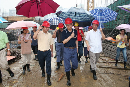 7月10日上午,校党委书记徐志平、副校长陈根芳在基建处负责人等陪同下,冒雨来到小和山校区1-H地块(后勤项目)工地现场,察看了工程进展情况。