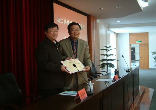 报告会前,校长杜卫代表学校向朱绍中教授颁发聘书,聘请朱绍中教授担任我校兼职教授。