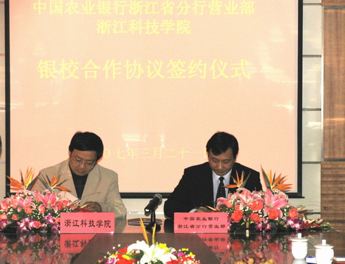 3月21日,我校与中国农业银行浙江省分行营业部签订银校合作协议。校党委书记徐志平,校长杜卫,校党委副书记胡浙平,副校长陈根芳,中国农业银行浙江省分行营业部党委书记、总经理汪勤,信贷管理部总经理郑刚敏,公司业务部总经理王火,个人业务部副总经理黄芳等出席签约仪式。仪式由陈根芳主持。