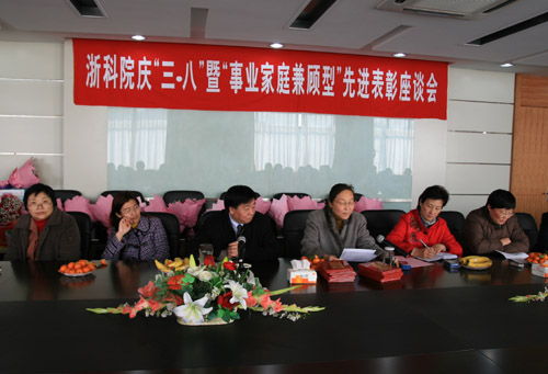 3月6日下午,学校召开庆“三八”暨“事业家庭兼顾型”先进表彰座谈会。校党委副书记胡浙平,校纪委书记、工会主席鲁凤出席会议。受表彰的2005-2006年度“事业家庭兼顾型” 先进个人,全校女教职工、女干部代表和校工会人员参加会议。男教职工代表也到会,祝女教职工节日快乐。