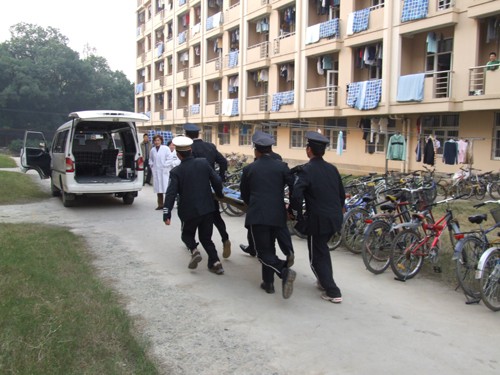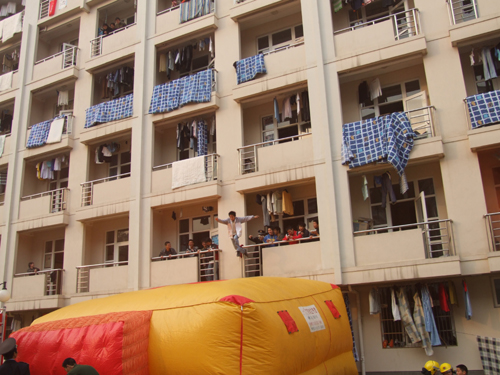 为了模拟火场情景,达到学生体验火场逃生的效果,保卫处在2K公寓8号楼2楼放置了烟雾弹。在各项工作就绪后,总指挥陈浩副书记一声令下,演习活动开始。一时间,8号宿舍楼2楼浓烟滚滚,学生被困楼内。发现“火情”的学生向校园110及消防大队报警,学生宿舍火灾疏散与逃生预案立即启动。各工作小组迅速到达现场,接到报警后的武警消防大队消防官兵和两辆消防车已随即赶来。宿舍楼各个楼层的紧急疏散通道迅速打开,在保卫干部和宿舍管理员沉着冷静的指挥下,学生们用湿毛巾捂住口鼻,猫着身子有序地跑出模拟火场,到达指定地点集合。一部分被堵在“火场”的同学,则纷纷通过消防队员架设的气垫跳楼逃生。