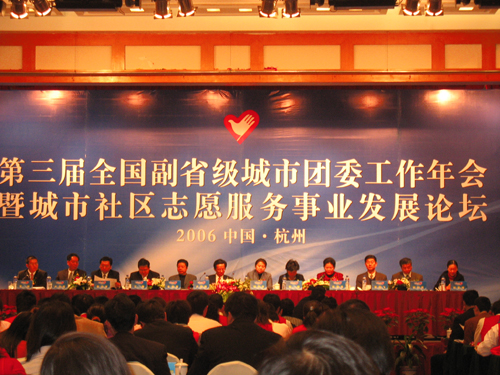 12月3日上午,我校青年志愿者协会派代表参加在浙江世贸中心举行的第三届副省级城市团委工作年会暨城市社区志愿服务事业发展论坛开幕式。出席会议的有团中央领导、杭州市委领导、浙江团省委领导以及受表彰的先进集体和个人。我校青年志愿者协会被评为2006年世界休闲博览会暨第八届中国杭州西湖博览会志愿者行动先进集体,蔡培津、张蕾、张杨、金斌鑫、高云飞、杜颖等6名同学荣获“西湖博览会志愿者行动优秀青年志愿者”称号。