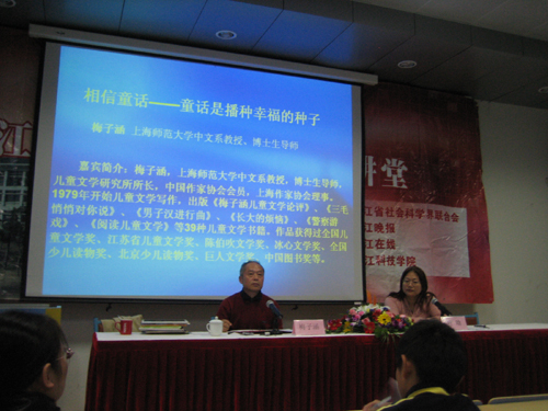 11月25日下午,浙江人文大讲堂小和山讲堂举行了一次别开生面的“相信童话——童话是播种幸福的种子”的讲座。由上海师范大学中文系教授、博士生导师梅子涵先生开讲。我校党委副书记胡浙平、教务处副处长文献民以及《钱江晚报》、浙江文艺出版社的有关人员出席了这次讲座。讲座由人文学院书记、副院长叶晗主持。