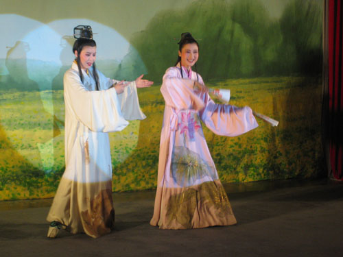 越剧团在我校连续表演了两场,内容既有经典剧目《梁祝•十八相送》,古典名著改编剧目《西厢记•传简》、《窦娥冤•斩娥》、《赵氏孤儿•夺子》,又有现代名著改编剧目《祥林嫂•抬头问苍天》和朝鲜名典名著改编的《春香传•端阳歌》。同学们热情高涨,与剧中人物同喜同悲,被演员们的俊美扮相、柔美唱腔和传神演绎深深感染,场内不时响起了阵阵的掌声。演出结束后,学校领导上台和演员们亲切握手和问候,浙江小百花越剧团特意赠送了他们演出的纪念光盘。