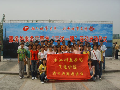 5月7日,生化学院50余位志愿者到西城广场参加杭州市外来务工人员“三送一建”(送文体设施、送文明知识、送医疗服务,建蒲公英文化家园)活动启动仪式。志愿者向外来务工人员发放了医疗和旅游等方面的资料。