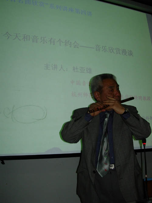4月7日晚,五百工程之“百首名曲欣赏”第四讲在小和山校区C1-106举行。中国音乐学院教授、杭州师范学院音乐艺术学院特聘教授杜亚雄应邀作了题为“今天和音乐有个约会——音乐欣赏漫谈”的讲座。我校师生近两百人聆听了讲座。