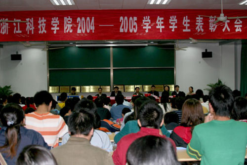 11月11日下午,浙江科技学院2004-2005学年学生表彰大会在小和山校区举行。校党委副书记胡浙平,校党委委员、副院长龚建立,校党委宣传部长、统战部长鲁维明,校学工部部长、学生处处长陈跃泉,校团委副书记郑友取等出席了表彰会。各二级学院学生代表260余人参加了大会,整个会场座无虚席,过道上也站满了自愿来参加的同学。