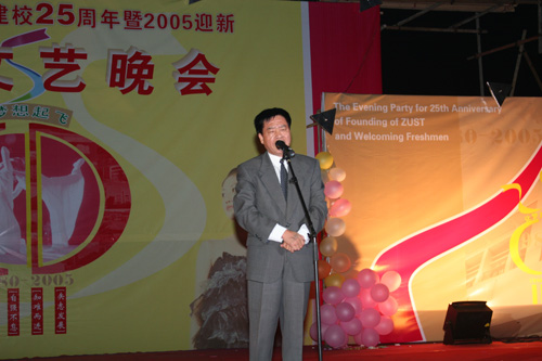 7点整,校铜管乐队雄壮的乐声拉开了晚会的序幕。胡浙平向晚会热情致辞。他代表学校党政向25年来关心学校发展的上级领导、校友和全体在校师生表示衷心的感谢和崇高的谢意。胡浙平说,25年来,在各级领导和代代师生的努力下,学校几易校名,办学水平和能力不断提升,现已发展成为一所以工科为主的多科性万人大学,并在办学实践中,逐步形成了具有国际化背景的高层次应用型人才的鲜明办学特色。在十六届五中全会胜利闭幕、神州六号载人飞船发射成功的时刻,我们迎来了建校25周年庆典。展望未来,我们信心十足,我们要继承前人的光荣传统和积累的丰富经验,为把我校办成水平高,声誉好,特色鲜明的大学而努力奋斗。