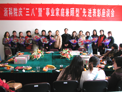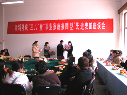 会上,机电系林江、计算机系刘云仙、信电系郑玉珍、生化系李菊清、土木系陈天虹、艺术系翁长庆、外语系楼青、理学系朱婉珍、教信系董岩、学报编辑部方秀菊、计财处潘建明、科源公司陈可珍等12名2003-2004年度“事业家庭兼顾型”先进个人受到表彰。获奖者和与会女教职工代表对如何更好兼顾事业和家庭进行了交流。