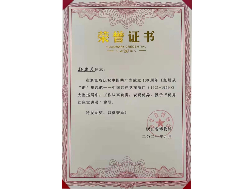 为庆祝中国共产党成立100周年,浙江省博物馆特别策划《红船从“浙”里起航——中国共产党在浙江(1921—1949)》特展,并面向社会招募组建“从浙博出发”百人红色宣讲团。孙建月同志第一时间报名浙江省博物馆党史宣讲活动,历经一个多月的培训、面试,成功通过浙江省博物馆考核,成为“百人红色宣讲团”中的一员,面向大众讲解展览,宣传推广红色革命文化。