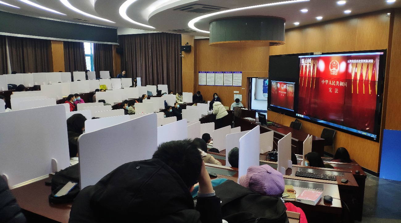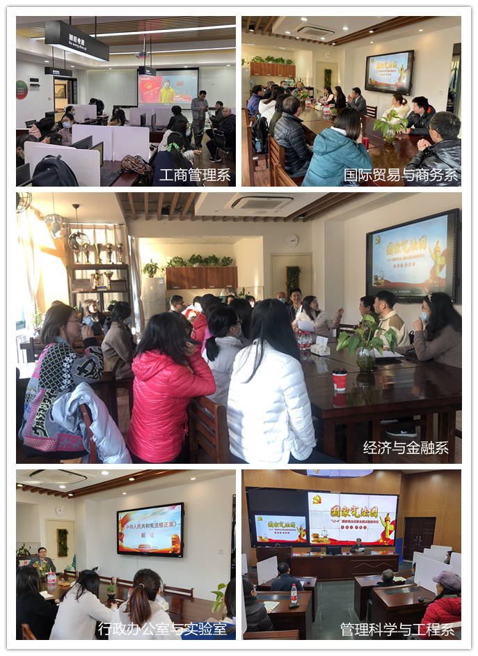 学院组织全体教职工集中观看《百炼成钢:新中国第一部宪法》《70年法治回眸·我们的自信在这里——宪法篇》、《焦点访谈:宪法守护美好生活》、《人民的宪法》等四部纪录片。12月2日至12月6日,学院五个教工党支部分别召开支部会议,结合各系专业特色,围绕“以习近平法治思想为指引 坚定不移走中国特色社会主义法治道路”主题开展学习讨论活动。