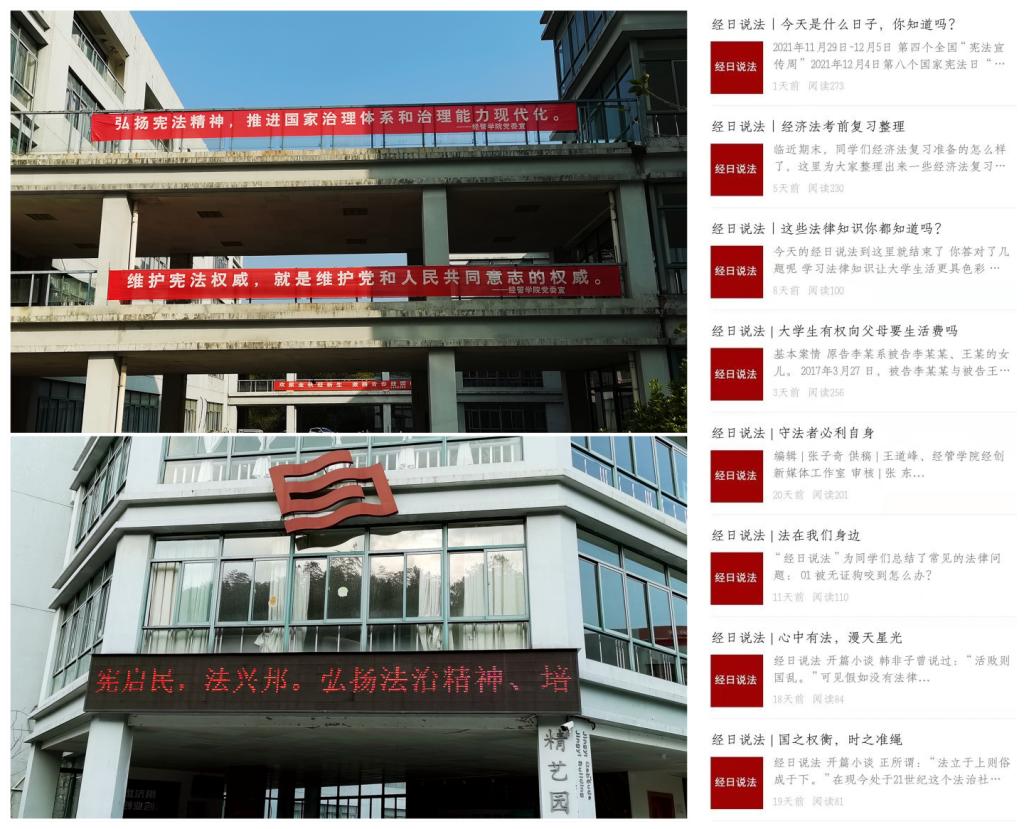 学院党委专题讨论制订“宪法宣传周”教育学习方案,积极营造浓厚的教育学习氛围。前期充分利用学院LED屏幕、横幅、海报等载体在精艺园B3楼附近布置宣传,营造学习宪法、尊崇宪法的法治文化氛围;在学院微信公众号推出8期“经日说法”专题宣传,面向全院师生宣传宪法知识和法治教育内容。