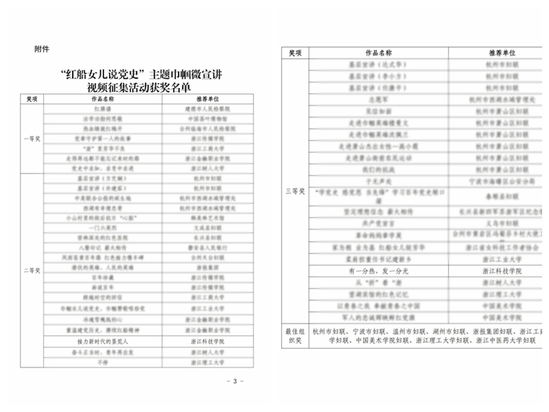 日前,省妇联公布“红船女儿说党史”主题巾帼微宣讲视频征集活动的评选结果,我校选送人文学院陆雩霞作品《接力新时代的垦荒人》获二等奖、信息学院李琳璇作品《有一分热 发一份光》获三等奖。