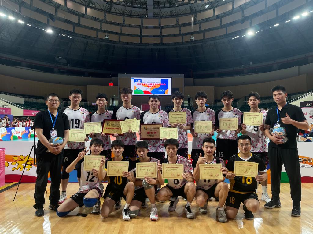 7月4—8日,浙江省第十六届大学生运动会排球比赛在湖州德清体育中心体育馆举行,共有83支高校队伍,约1300名运动员和教练参赛。我校男女排球队参加甲组比赛,校男子排球队在教练郑娄杰、申屠玉剑的带领下,经过六轮比赛,获得第七名,男排队获得本次大运会道德风尚奖,杨世宇、金英楠两位队员获得优秀运动员称号。